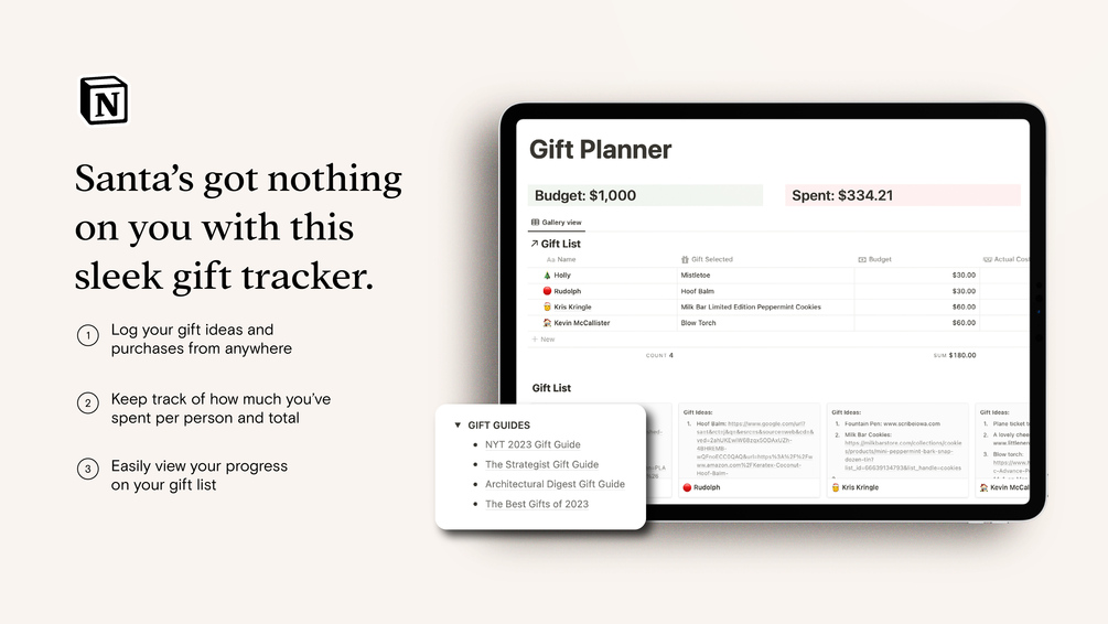 The best gift givers keep track of great ideas all year long. Using the gift tracker to create personalized profiles for each recipient, record their preferences, and wishlist items can help you effortlessly manage your holiday shopping and allocate your budget effectively. This strategy helps you save time (and money), reduce stress, and make the holiday season truly special by giving thoughtful, personalized gifts. Say goodbye to scattered notes and links, this is like having Santa's list right at your fingertips.